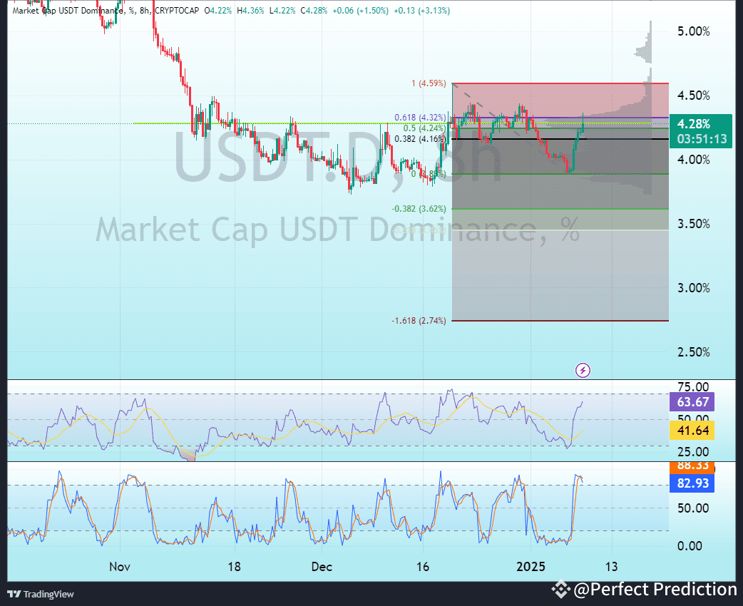 The USDT Dominance graph has a resistance at 4.32% Fibonacci, from which the graph could get rejected. RSI is coming near overbought levels and may weaken the momentum. On the contrary, BTC's daily chart depicted a textbook triple bottom pattern, strong bullish reversal. Bollinger Bands contraction could indicate an imminent price move. Meanwhile, upward momentum in the Stochastic RSI shows that the buying pressure is raising. If USDT dominance starts to fall, this could fuel the biggest Bitcoin rally, which might push it to the target of $110K. This makes the indications all align very strongly with the case for an imminent pump.