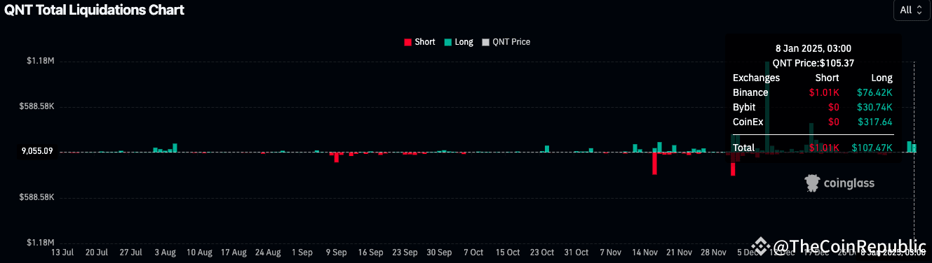 Long Liquidations: $107.47K, primarily on Binance ($76.42K) and Bybit ($30.74K).