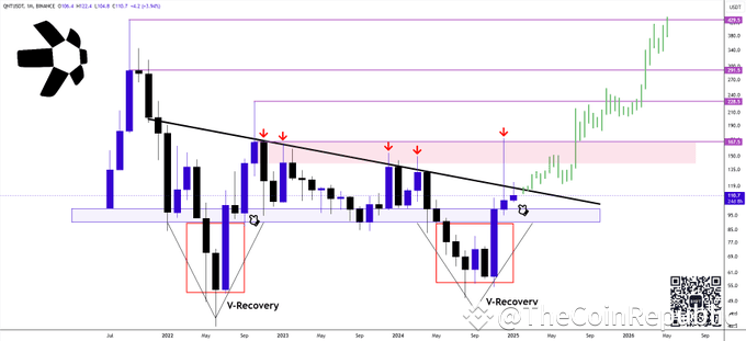 Market cap currently stands at $1.48B, with a circulating supply of 15 million QNT. Analysts believe recent dips are part of accumulation, as seen in past V-shaped recoveries in May 2022 and December 2024.