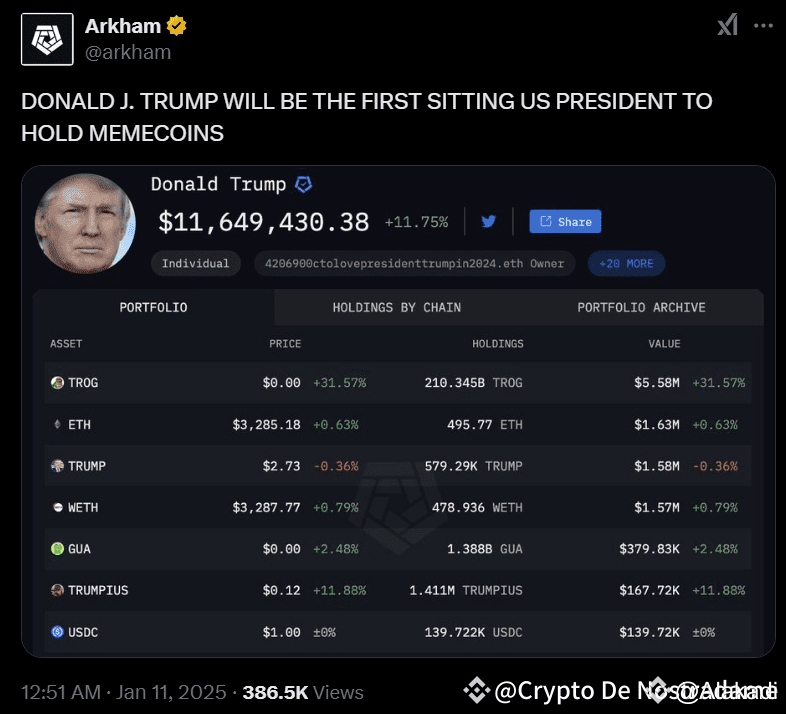 إن ظهور دونالد ترامب كـ "رئيس عملات الميم" هو تطور مفاجئ لقائد كان قد وصف العملات المشفرة سابقًا بأنها احتيال. وفقًا لتقرير حديث من أركهام إنتليجنس، تمتلك محفظة ترامب الآن عملات ميم بقيمة تزيد عن 8 ملايين دولار. يمتلك 5.5 مليون دولار في #TROG ، وهو رمز ممتع مرتبط بالثقافات الفرعية على الإنترنت. لديه 1.5 مليون دولار في رموز #TRUMP مرتبطة بشخصيته بشكل مباشر. تشمل محفظته أيضًا 1.3 مليار عملة GUA بقيمة حوالي 400,000 دولار، ورمز آخر مبني حول علامته التجارية، #trumpius ، بقيمة 167,000 دولار.