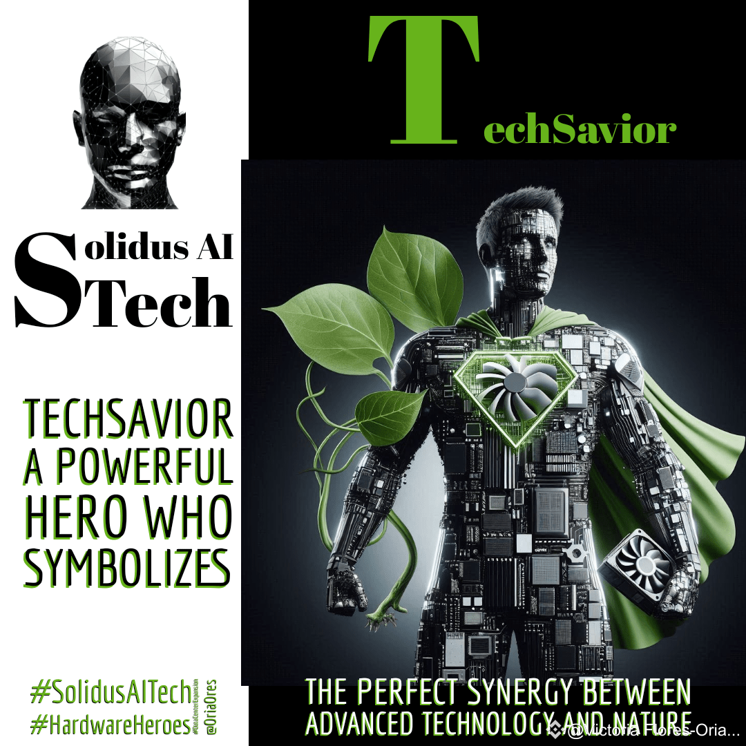 Inspired by their vision they develop Techsavior a superhero created by fusion of an advanced GPU node and HGX servers with a plant, Techsavior is born in the Solidus Ai Tech laboratory where Pablo, Adrián and his team work tirelessly to perfect their creation with the powerof calculation and energy efficiency of the GPU nodes and HGX servers, to empower Techsavior with superhero capabilities, the plant provides Techsavior with a symbiotic connection with nature, allowing it to regenerate and purify its environment.