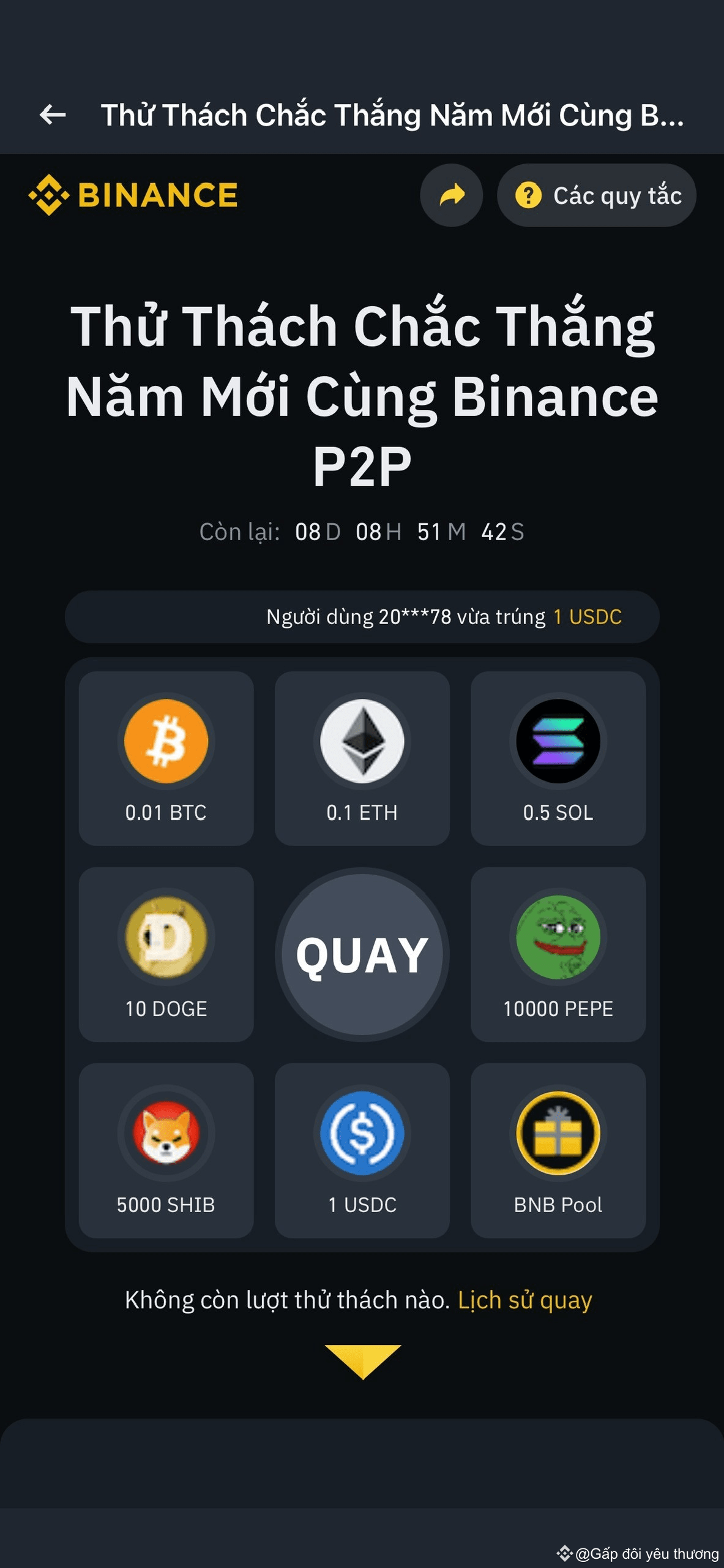 Khép lại năm cũ 2024, Binance P2P ra mắt sự kiện Đón Mừng Năm Mới 2025 dành riêng cho người dùng ở một số nước Châu Á. Tất cả người dùng hợp lệ đều có thể tham gia và 100% nhận thưởng các token hot nhất hiện nay như BTC, ETH, BNB, SOL, DOGE, SHIB, PEPE và USDC với tổng quỹ thưởng trị giá 10,000 USD! Người dùng hợp lệ khi hoàn thành nhiệm vụ mua tiền mã hóa qua P2P sẽ có cơ hội nhận thưởng lên đến $1,000 bằng BTC.