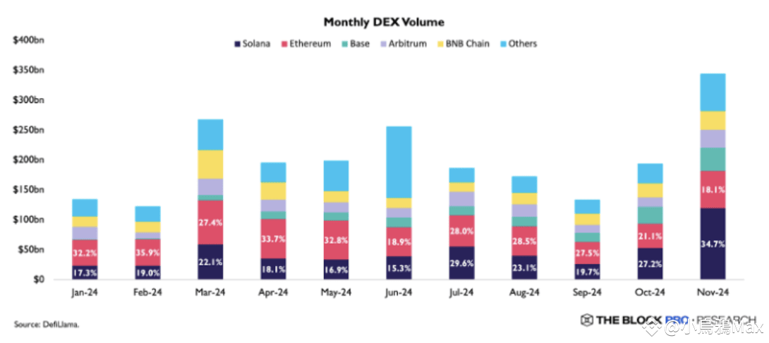Solana 的高吞吐量和平行執行能力使其成為迷因幣交易的首選平台,月度 DEX 交易量首次超過以太坊,累計費用也創下新高,僅次於以太坊和波場。