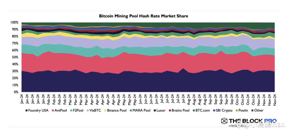 值得注意的是,礦工收入的組成發生了變化,鏈上資產交易的費用佔比在 2023 年 12 月一度超過 1/5,表明比特幣鏈上活動的性質正在發生變化。然而,礦池的集中化問題仍然存在,Foundry USA 和 Antpool 兩大礦池控制了超過 50% 的算力,引發了對交易審查的擔憂。