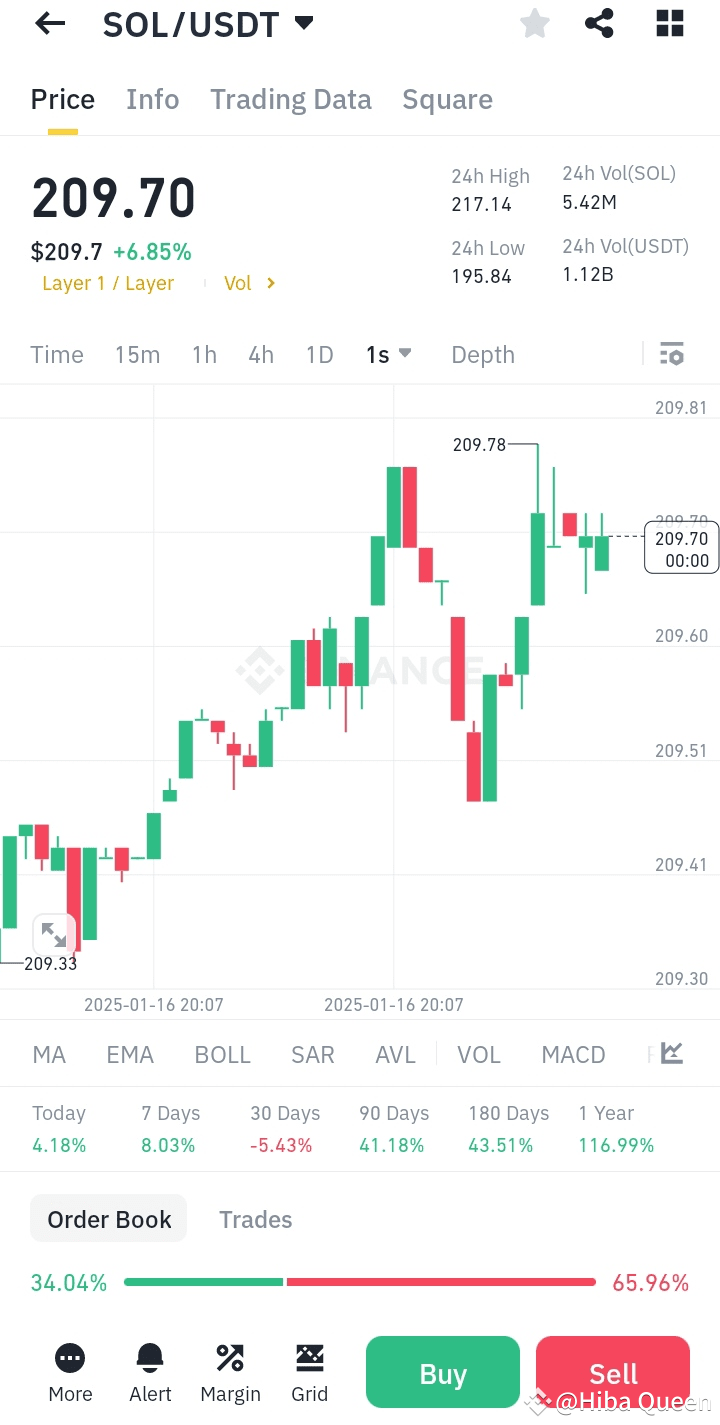 Current Price: SOL is trading at $209.70, up by +6.85%.
