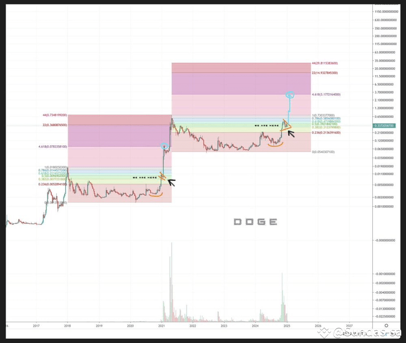 A chart shared by Investments CEO shows a setup that could resemble Dogecoin's 2021 rally, with the potential to soar all the way to $3.00 if the bullish momentum continues. A surge of this magnitude would represent a 10X rally from its current price level.