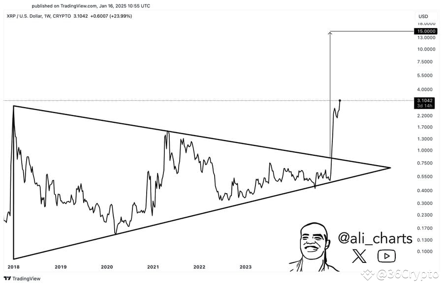 Ali (@ali_charts), a well-known crypto analyst who accurately forecasted XRP’s recent rally to $3, now projects a bullish target of $15. His prediction comes after observing a breakout from a symmetrical triangle pattern on XRP’s monthly Chart. This breakout, often indicative of a long-term bullish trend, suggests substantial upside potential for the cryptocurrency.