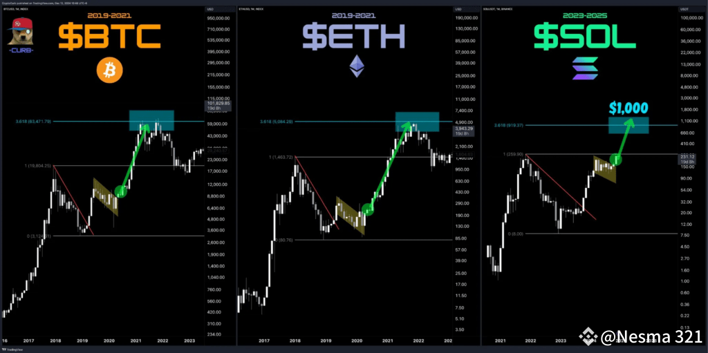 أظهرت حركة سعر سولانا أوجه تشابه مع الأداء التاريخي لعملة البيتكوين (BTC) والإيثريوم (ETH) خلال دورتيهما 2019-2021.