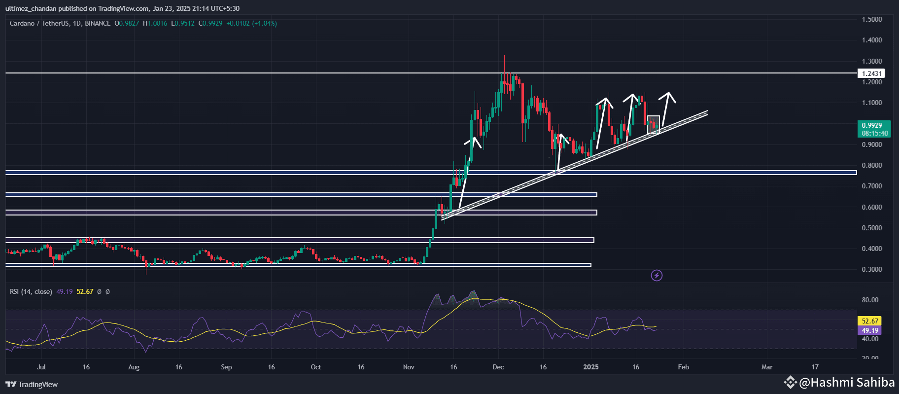 Besides the expert prediction, $ADA is currently experiencing price consolidation within a narrow range between $0.954 and $1.03 at the support level of an inclined trendline. Since November, ADA has found support at this level four times, each time witnessing impressive upward momentum.