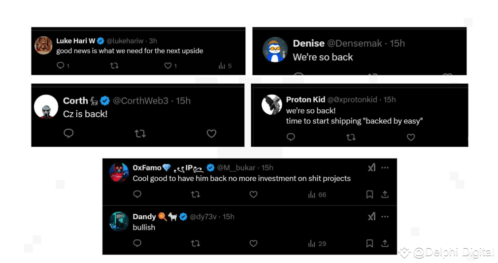 Posts on X (Twitter) from many members of the community showed a clear bullish sentiment, with comments such as "CZ is back!", "We're so back!", and commented that CZ's return will help support potential projects more.