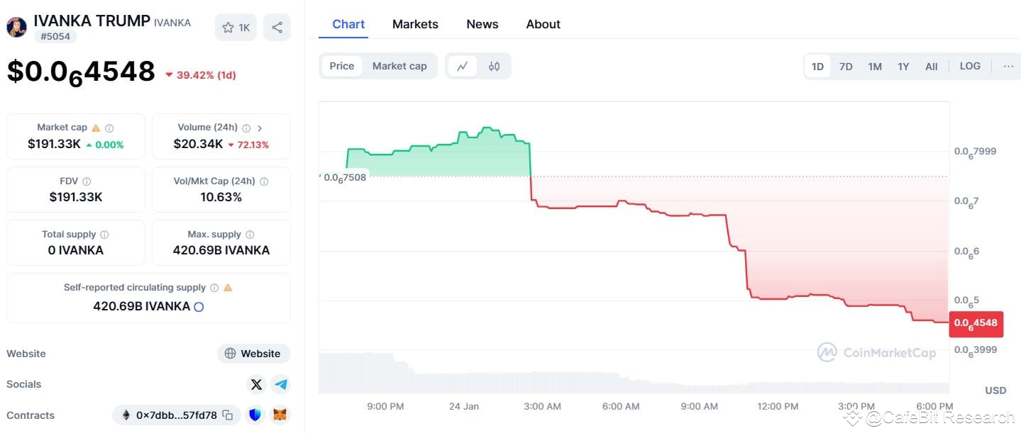 IVANKA đã được phát hành trên blockchain Ethereum và có giá chưa tới 0,01 USD. Hiện tại vốn hóa 191k usd, nguồn cung tối đa là 420.690.000.000 đồng IVANKA, theo thông tin từ CoinMarketCap.