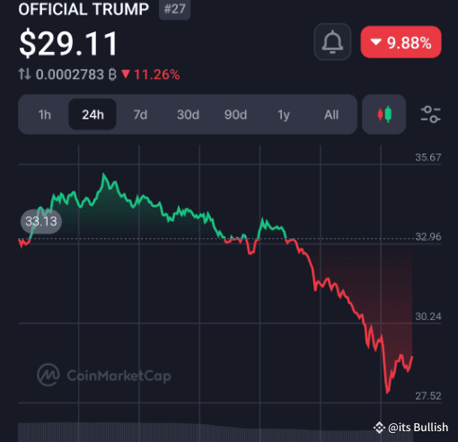 TRUMP currently trading at $28.97, down 11.27% over the past 24 hours. Its RSI indicates extreme oversold conditions, signaling possible seller exhaustion. However, there are no definitive signs of a reversal just yet.