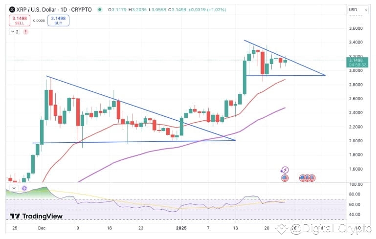 XRP is currently trading at $3.14. From the Nov of last year, XRP has been in bullish mode. The chart patterns show that XRP is making a triangle pattern and at the breakout, it is set to move upwards. In the past, XRP prices had similar momentum after the triangle breakout. XRP price has surged about 51%. The 20 EMA Orange line is also near the same zone and its working as an XRP price support for a long time and it looks to be holding and pushing upwards.