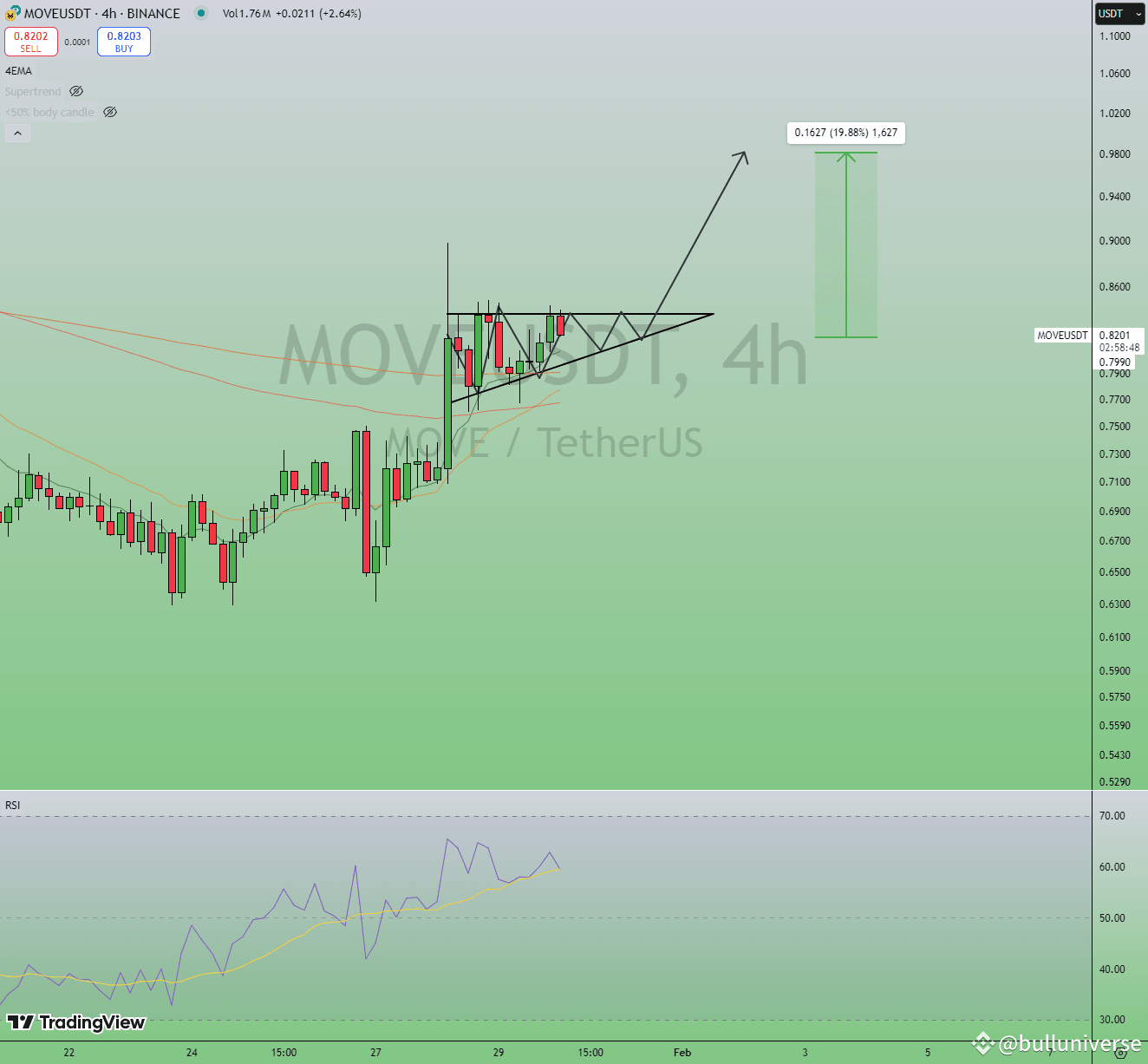 On the 4-hour chart, MOVE Coin has formed a bull flag pattern, a strong continuation indicator. 📈 If the price respects the downside trendline and breaks upward, we could be targeting a 20% movement soon! 🚀