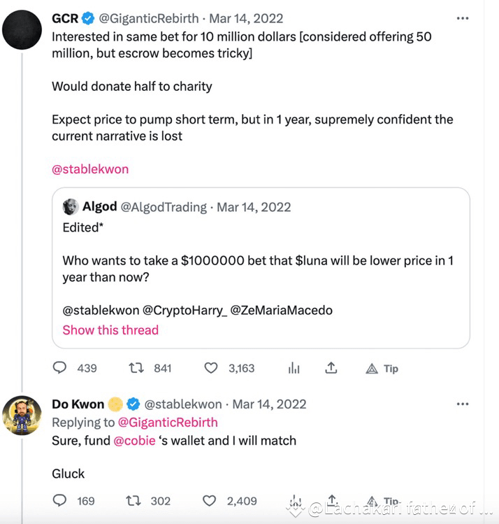 In March 2022, GCR challenged $LUNA founder Do Kwon to a bet worth $10M