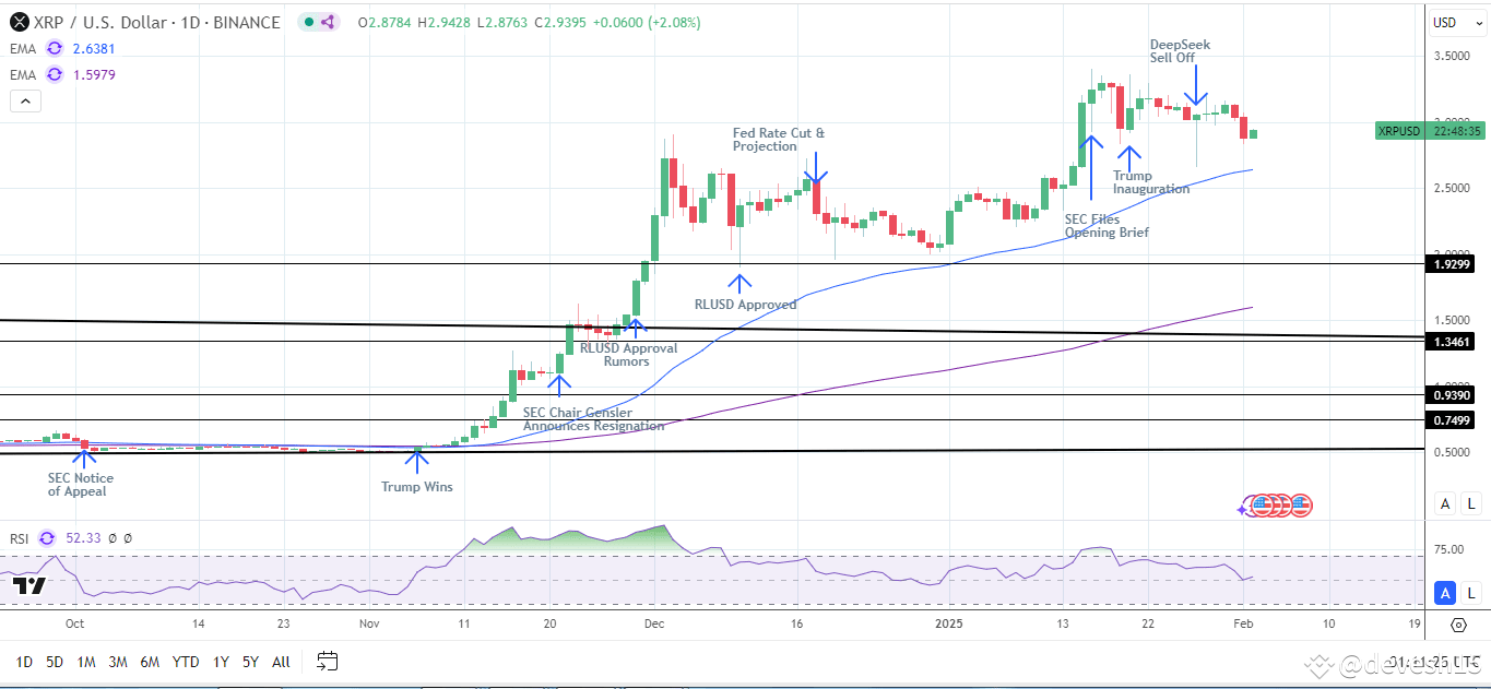 Despite Saturday’s drop below $3, $XRP sits well above the 50-day and 200-day Exponential Moving Averages (EMA), sending bullish price signals.