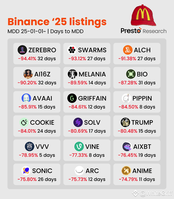 The analytical center Presto Research conducted a study that revealed a catastrophic decline in the value of new cryptocurrencies listed in 2025. The study covered 18 tokens, each of which lost between 74% and 94% of their initial price within just days or weeks after listing.