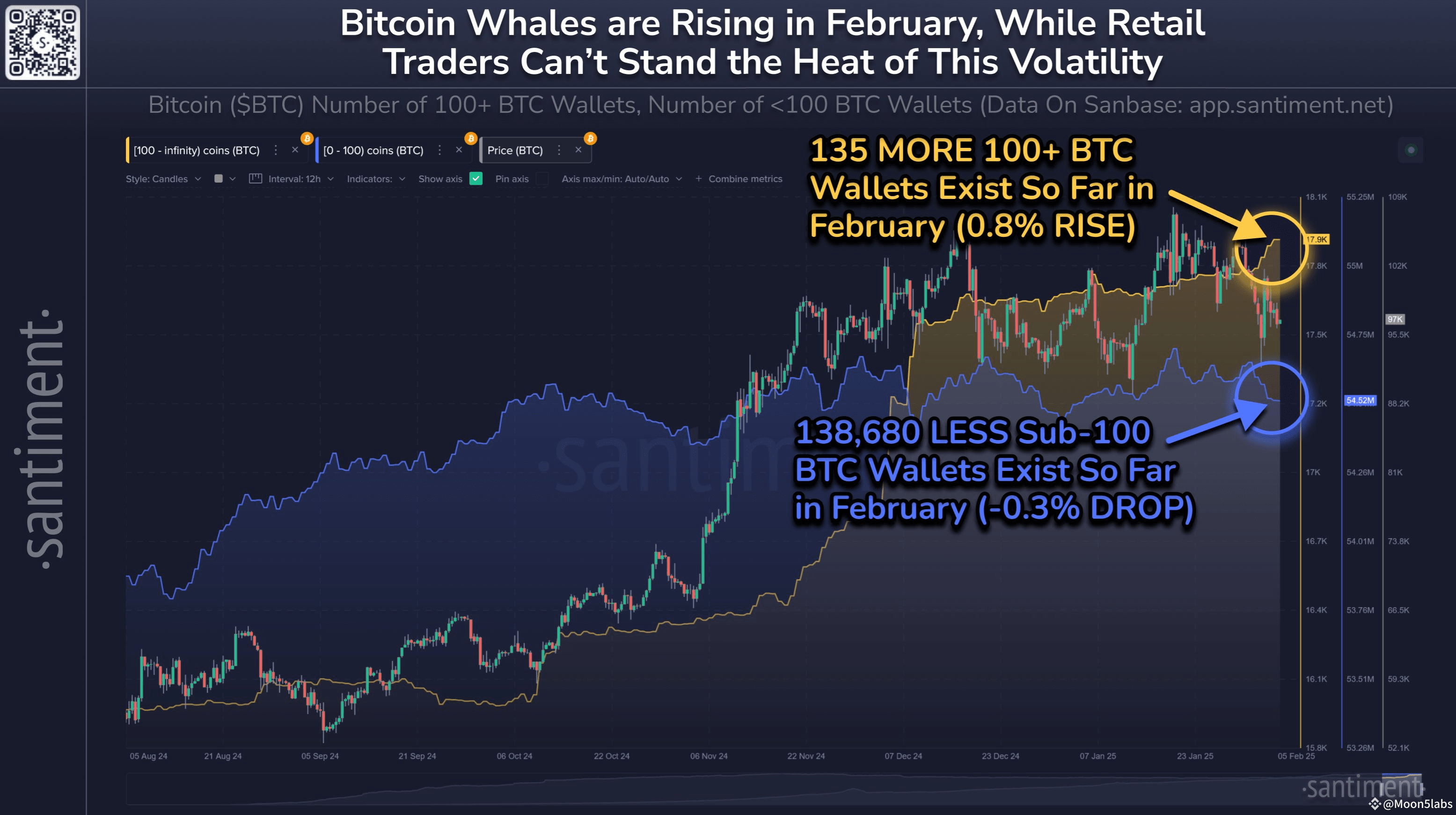 Santiment’s data shows that the number of addresses holding less than 100 BTC has decreased by 138,680 wallets in February.