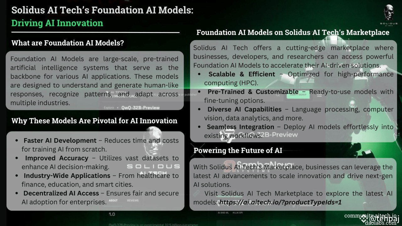 Unlike traditional AI models, which often require extensive computational power and training from scratch, Solidus AI Tech’s AI Marketplace provides pre-trained Foundation AI Models that are optimized for performance and cost-efficiency. Here’s how they stand out: