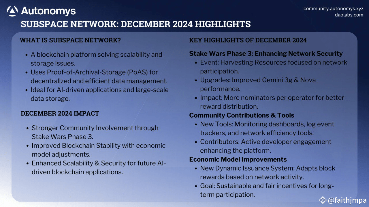 December 2024 was a transformative period for Subspace Network. The successful launch of Stake Wars Phase 3 demonstrated the network's growing stability and the community's active participation. The introduction of dynamic issuance and economic updates showcased the project's commitment to a balanced and fair ecosystem. Collectively, these developments have strengthened Subspace's position as a leading platform in decentralized storage and computation, paving the way for future innovations in blockchain and AI integration.