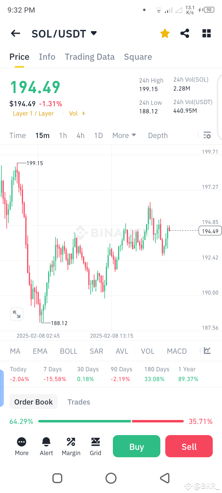1. Price Movement: The current price of SOL/USDT is $194.49, showing a slight decrease of 1.31%. The price has been fluctuating within a range, indicating potential consolidation.