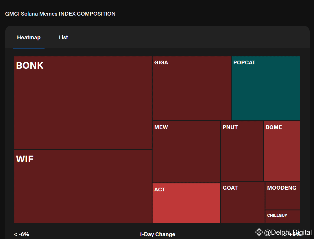 Among the crypto asset classes, memecoins on Solana are the hardest hit. The GMCI Solana Memes (GMSOLMEME) index has fallen by 10% in the last 24 hours, with large-cap tokens such as Bonk, Dogwifhat, and Gigachad all in a downtrend.