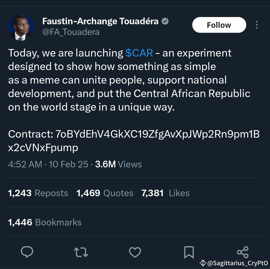 “Today, we are launching $CAR 🇨🇫— an experiment designed to show how something as simple as a meme 😂 can unite people 🤝, support national development 💡, and put the Central African Republic on the world stage 🌍 in a unique way,” CAR President Faustin-Archange Touadéra’s X account wrote Sunday.