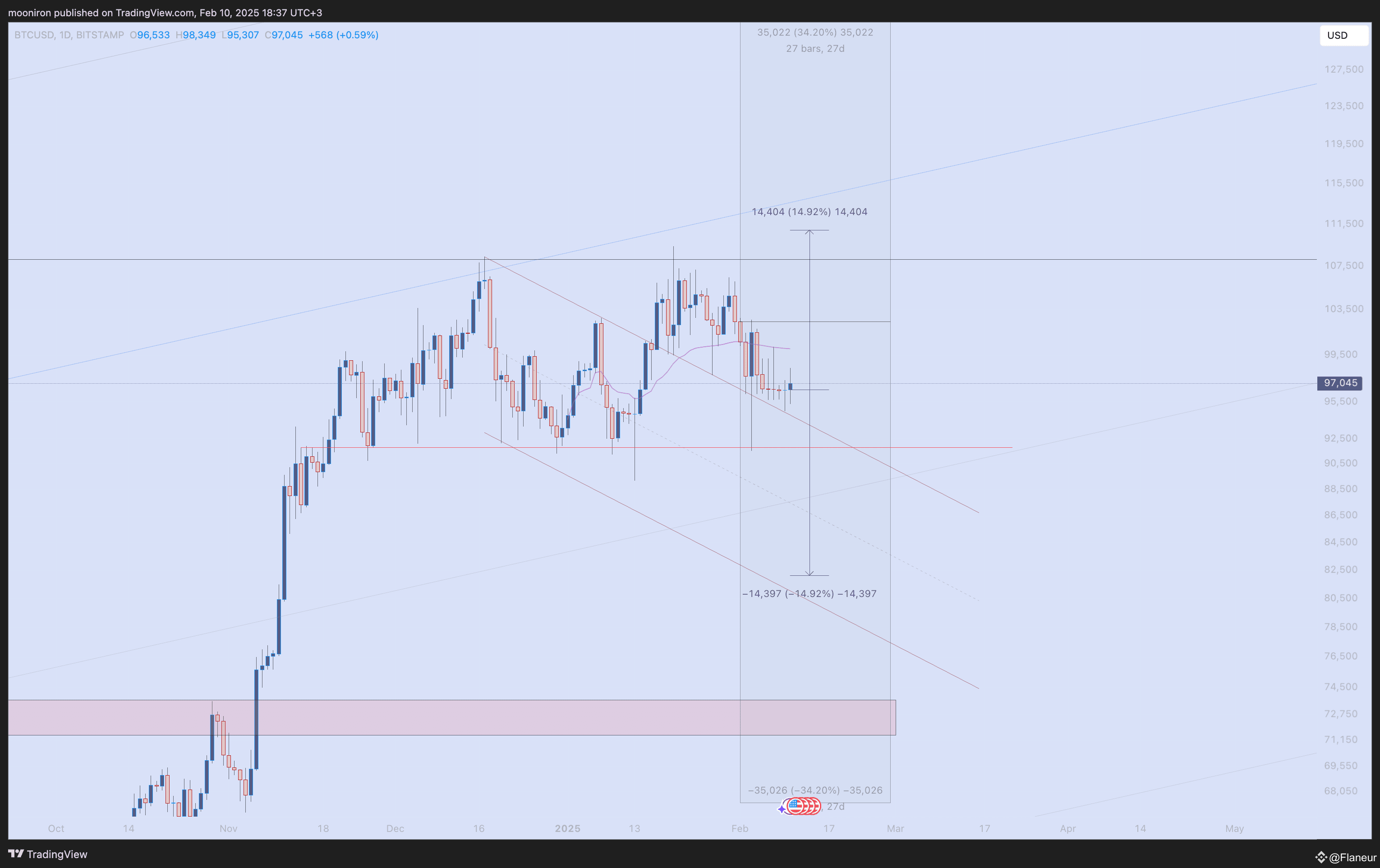 We can define this week's implied volatility range between 82k and 111k. Due to price compression, the upcoming movement is likely to be rapid. I don't think the price will drop much below 94k. I expect the next movement to be towards the 113-115k region and am positioning accordingly.