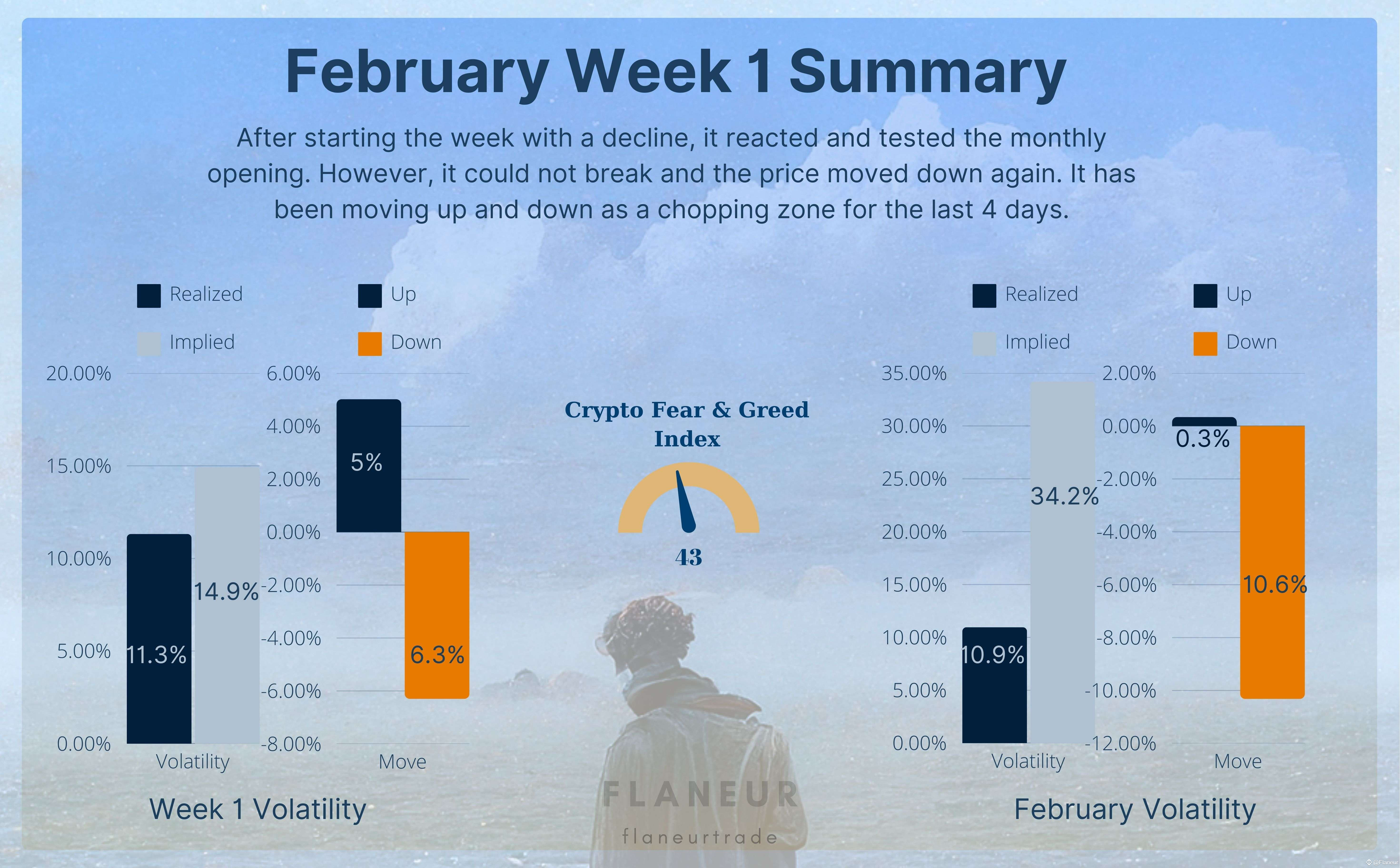 BTC, with February's weekly implied volatility of 14.9%, realized an 11.3% movement. We generally saw continuous up and down price movement. Currently testing last week's opening price. We can assume there's a waiting period, likely due to news expectations. While February's implied volatility is 34.2%, we've seen a 10.9% movement in 10 days.