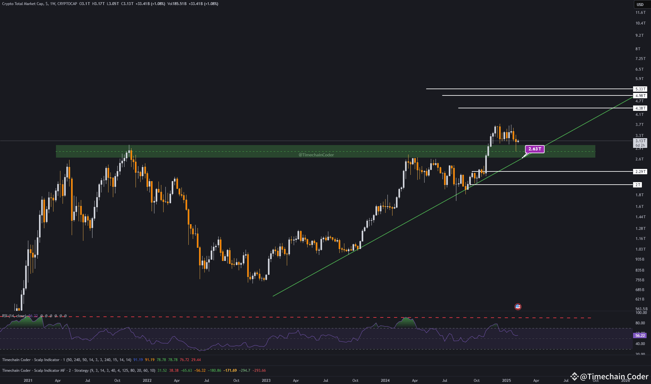 Normally, if we do not see an immediate recovery with a big V bounce after such deep declines, first the middle of the wick, then the lowest end of the wick can be targeted again. It is important to follow the course here. Staying above the green box first targets the green box in the middle, then the red box above, but if we are going to see another liquidation event beforehand, it is important to follow the levels I marked on the wick and not to see a daily candle closing below $2.80T.