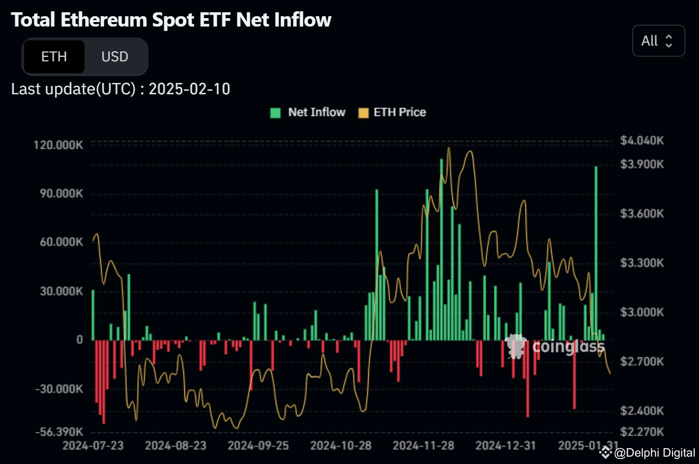Although the CME market is betting heavily on ETH's possible downside, the inflows from ETFs show a completely different picture. Over the past three weeks, ETH has attracted more than $2 billion, including a record $854 million inflow in just one week from Wall Street, the highest level ever.