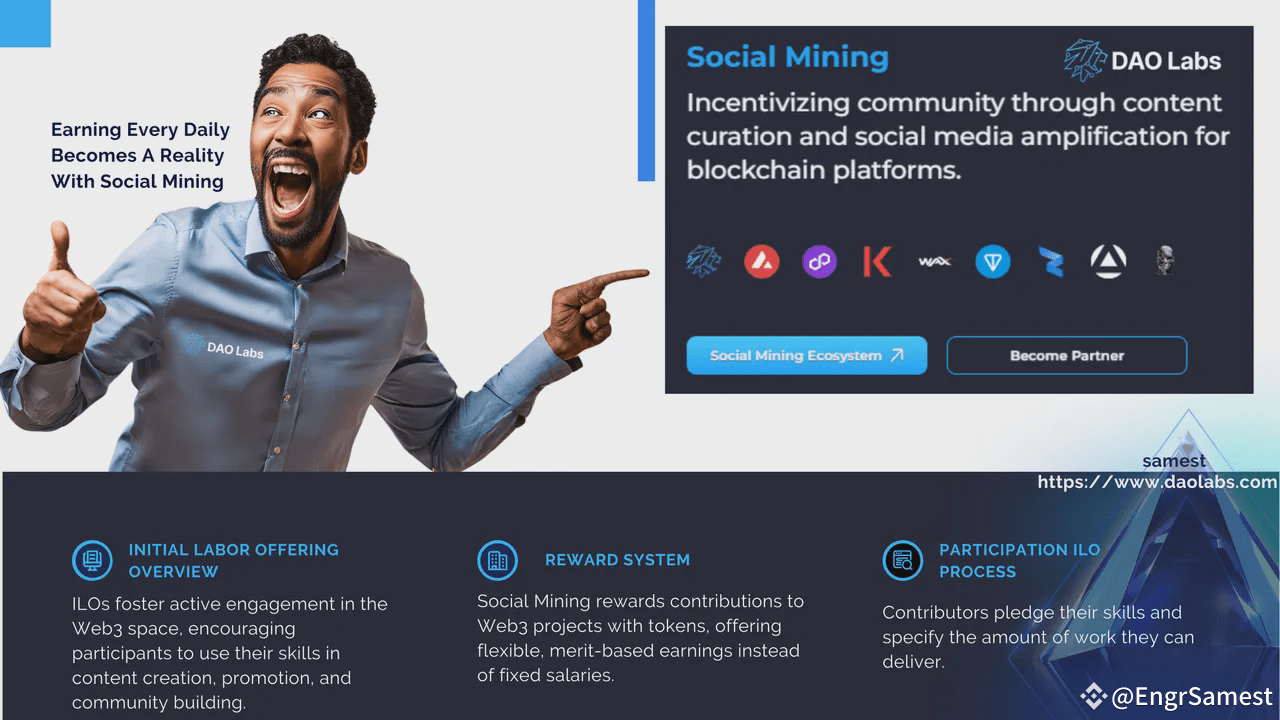 Social Mining is a Web3-powered system that rewards individuals for their contributions to decentralized projects. Instead of working for a fixed salary, contributors earn tokens and incentives by adding real value—whether through #ContentCreation , governance participation, marketing, or community engagement.