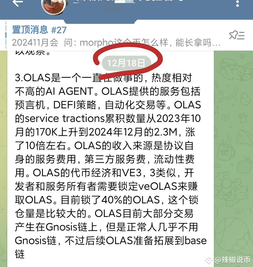 1.除了Ai16z,Virtual等大热的AI Agent,最近有一个币悄悄上线了币安alpha,但目前关注的人不多。这个币就是Olas。