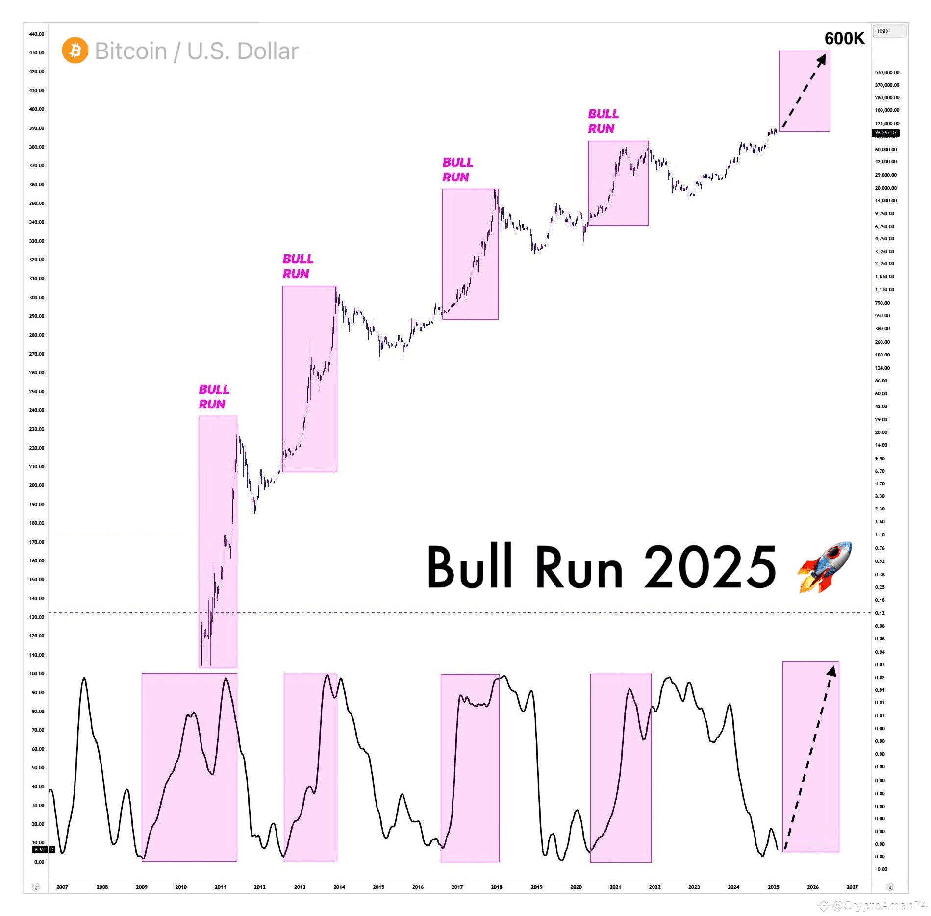 Each highlighted pink box in the chart marks a historical bull run, all of which followed deep corrections and periods of low investor confidence. Yet, each time, Bitcoin has shattered expectations, climbing to new all-time highs.