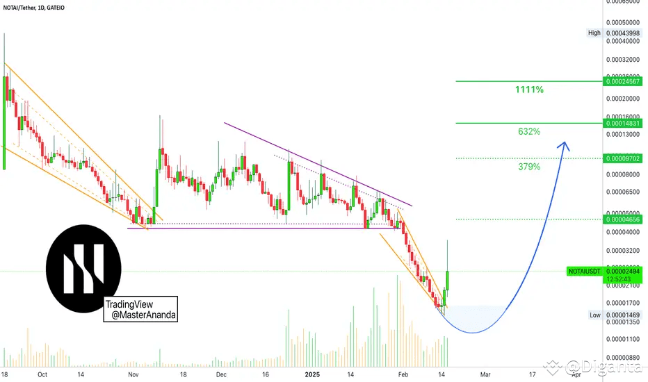 Take a close look at NOTAI's chart. What do you see? A fresh All-Time Low (ATL) coinciding with a vibrant green candle and rising volume. This is a classic signal of a potential bottom forming – the perfect springboard for a massive bull run! 🐂