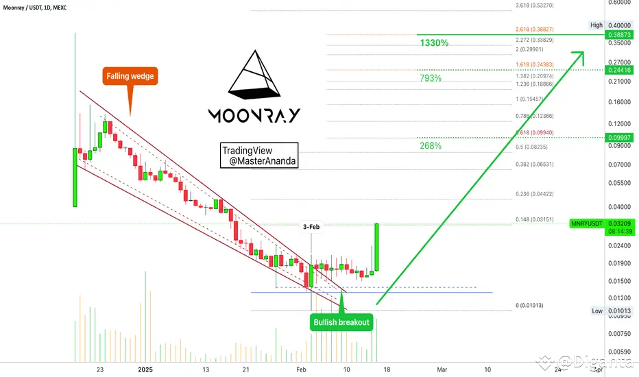After a brief period of sideways movement, Moonray has emphatically broken out of the falling wedge! This powerful breakout signals the beginning of a major uptrend.