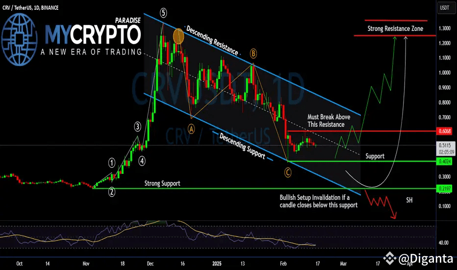 CRV is currently navigating within a descending channel, forming a classic A-B-C correction after its impressive five-wave rally. Think of it like a breather after a sprint! The price has landed on a key support level around $0.40, which could be a launching pad for a reversal if buyers step in. 🐂