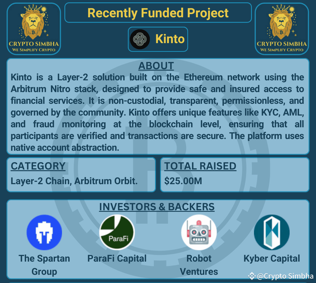 🔹About: Kinto is a Layer-2 solution built on the Ethereum network using the Arbitrum Nitro stack, designed to provide safe and insured access to financial services. It is non-custodial, transparent, permissionless, and governed by the community. Kinto offers unique features like KYC, AML, and fraud monitoring at the blockchain level, ensuring that all participants are verified and transactions are secure. The platform uses native account abstraction to allow users to access crypto financial services without needing browser extensions or seed phrases. Kinto aims to bridge the gap between traditional financial institutions and decentralized finance by providing a secure environment for both users and developers. The governance token, $KINTO, is used for on-chain voting and decision-making. Kinto recently launched its public sales and continues to develop its ecosystem to support financial applications and institutions.🚀🌐