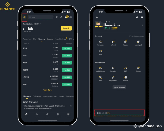 Binance Lite is a streamlined version of the Binance app that simplifies the trading process. With less complex features compared to the full Binance platform, it’s ideal for users with slower internet connections or older devices. It's easy to navigate, and you can quickly access the information you need without overwhelming details. On your home screen, simply tap on the top left corner, and you’ll see "Binance Lite" displayed for easy access.