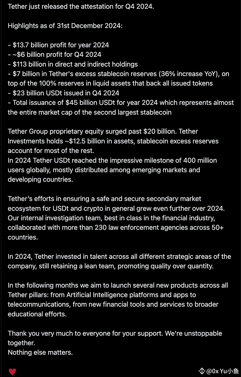 目前USDT流通量突破1200亿美元,覆盖超4亿用户,这意味着即使仅以美国国债4%的年化收益率计算,Tether每年即可获得近50亿美元的利息收入,而实际收益可能通过更高收益的资产配置进一步放大。