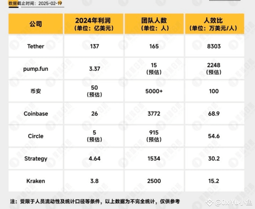 加密企业的人效奇迹不仅源于技术红利,更来自组织形态创新。Tether、pump.fun等团队将核心职能(技术开发、资金管理)高度模块化,通过远程协作减少管理损耗。Coinbase虽保持传统公司架构,但通过自动化交易系统将客服人员占比压缩至8%,远低于传统券商30%的水平。这种“极简主义”组织模式,或许为未来企业形态提供重要参照。
