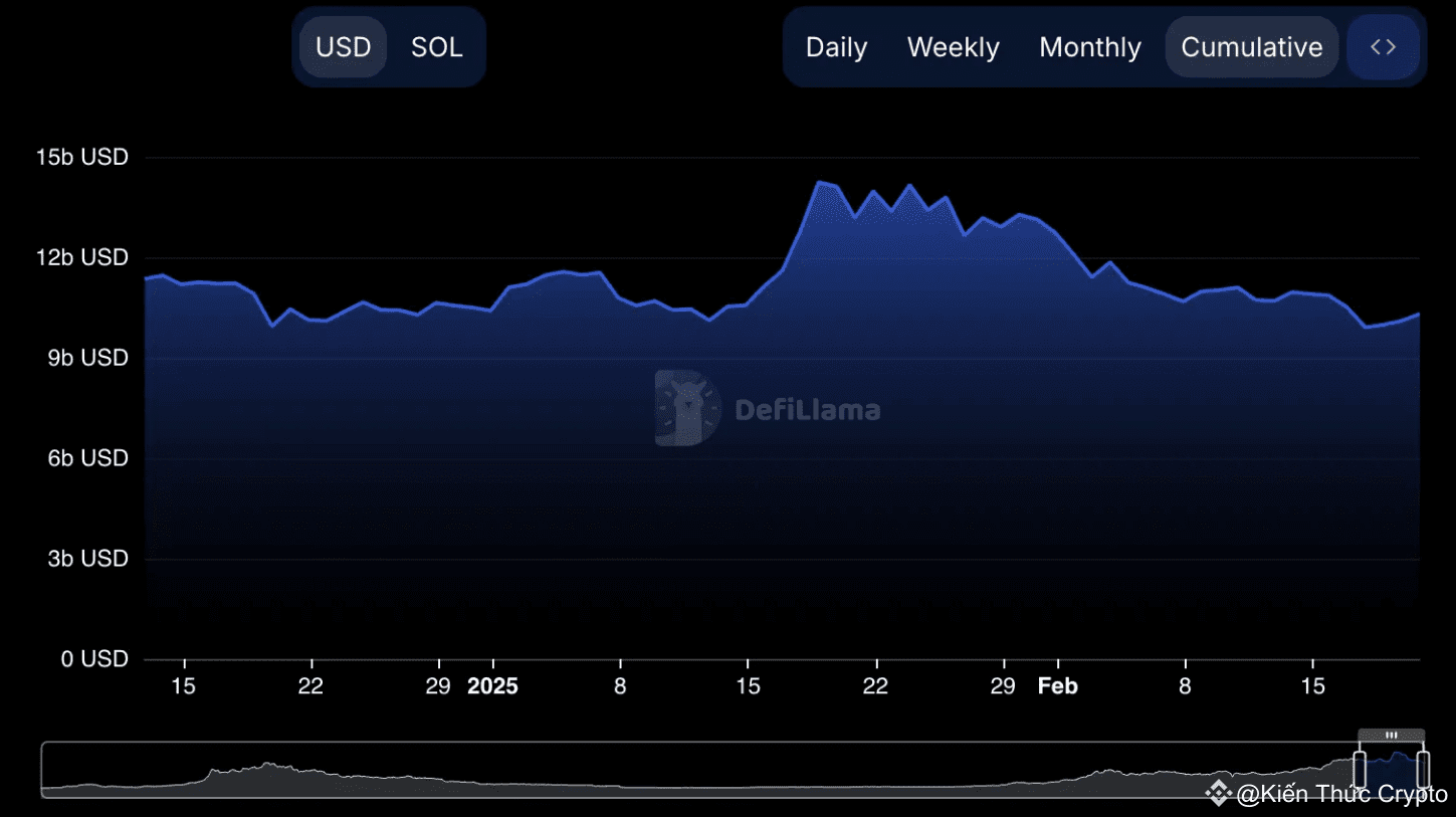 Tổng giá trị bị khóa (TVL) của Solana hiện ở mức 10,3 tỷ USD, phục hồi từ mức thấp 9,90 tỷ USD vào ngày 17/2 – đây là mức thấp nhất kể từ ngày 14/11/2024. Dù có sự phục hồi này, TVL vẫn giảm gần 30% so với mức 14,2 tỷ USD vào ngày 18/1, cho thấy niềm tin của nhà đầu tư đang suy giảm.