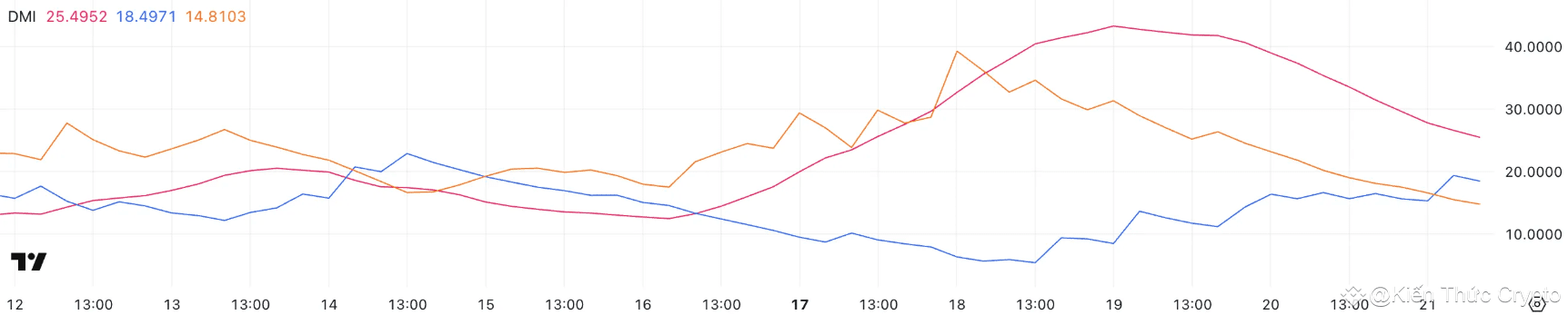 Sự sụt giảm của ADX cho thấy sức mạnh của xu hướng giảm đang suy yếu, mặc dù xu hướng này vẫn đang tồn tại. Một ADX trên 25 thường báo hiệu một xu hướng mạnh, nhưng giá trị giảm dần cho thấy đà giảm đang mất dần động lực, có thể dẫn đến một giai đoạn tích lũy.
