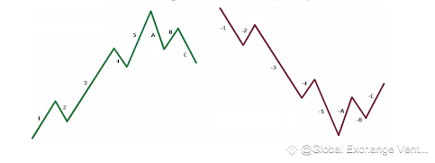 Después de completarse el avance de las 5 ondas, comienza un proceso correctivo de 3 ondas, a, b y c.