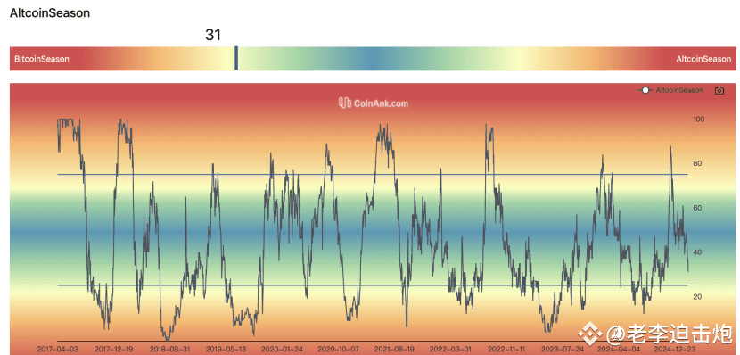 CoinAnk 数据显示,山寨币季节指数(#AltcoinSeasonIndex )现报31,较上周下降11点。该指数显示在过去90天内,市值前100加密货币中仅有约31个项目涨幅超越比特币。