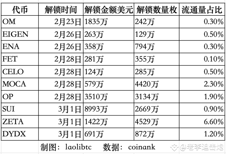 Sui的SUI于3月1日解锁,Layer1赛道,103.7亿流通市值,8993万解锁金额、2669万枚,占0.9%;