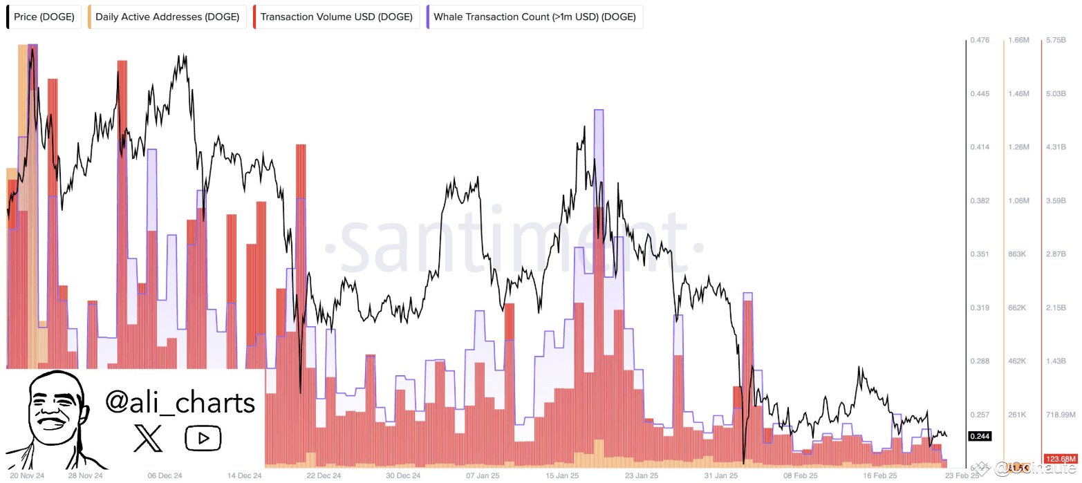 Transaction volume and network engagement show a major decrease according to the chart shared by crypto analyst Ali. The price recovery of DOGE faces challenges while investors confront skepticism about its upcoming performance.