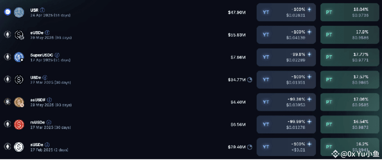 USDe 和 sUSDe 池:3月27日到期的 USDe PT 池 APY 为 17.57%,而 5月29日到期的 sUSDe PT 池 APY 为 13.49%。