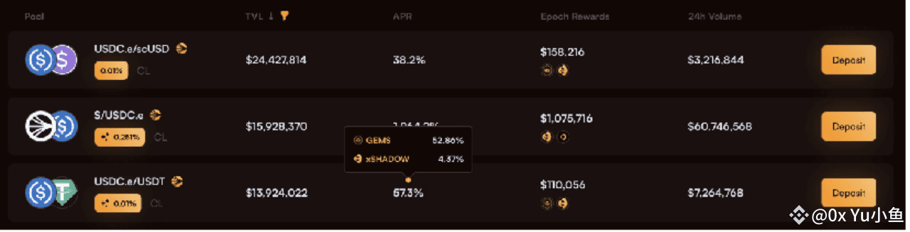 Shadow DEX:USDC.e - scUSD LP 的 APR(年化收益率)高达 38.2%,而 USDC.e - USDT LP 的 APR 更是达到了 57.3%。然而,奖励主要以 xSHADOW 和 GEMS 的形式发放,xSHADOW 需要 6 个月才能解质押,GEMS 则是未来空投凭证,兑现时间较长。