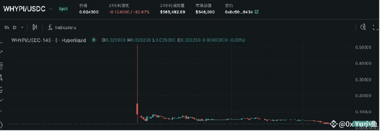 然而,上线 Hyperliquid 现货市场后,HYPI 的表现却令人失望。其包装资产 wHYPI 的价格迅速下跌至 0.024 美元,市值缩水至 54 万美元,跌破铸造成本。那些在场外以 25 美元/张高价收购 HYPI 的玩家,如今只能“哭晕在厕所”。